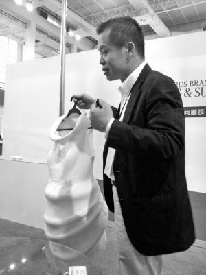 服博会上,台湾一家企业展示了一种服装,粗看没有什么特别,仔细一看,整件服装看不到针线的影子。“这是一种喷出来的衣服,只要顾客选定颜色和式样,站在一种专用机器面前,20分钟就能喷出一件满意的服装,像这几件样品,我们是喷在模特架上成型的。但这个也可以直接喷在人的身体上成型。绝对贴身,而且独一无二。”据参展商介绍,这种服装的原料是无纺布纤维、棉、毛等组成,喷在身上会瞬间凝固成型,通过调节喷口和人身体的距离,还能使成型的服装展现出不同的效果。据了解,喷一件衣服的价格在2000元人民币以内。