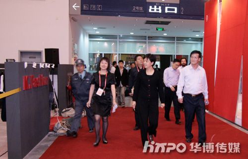 宁波市委常委、副市长余红艺(前中)视察服博会展馆
