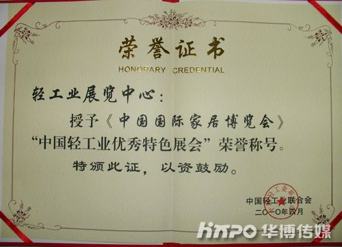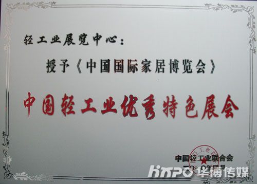 (通讯员 成羽)2010年4月7日,中国轻工业联合会二届五次理事会暨全国轻工行业工作座谈会在南昌隆重召开,同时授予中国国际家居博览会“中国轻工业优秀特色展会”的荣誉称号。