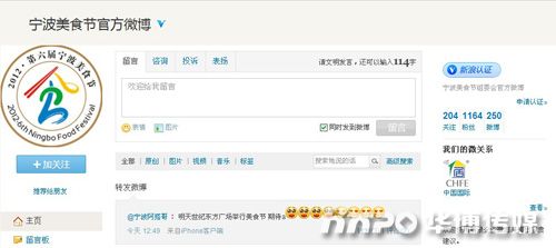 近期美食节官方微博(昵称:宁波美食节官方微博 //weibo.com/nbmeishijie)也广受各界关注,截止发稿,粉丝数已达1164位。