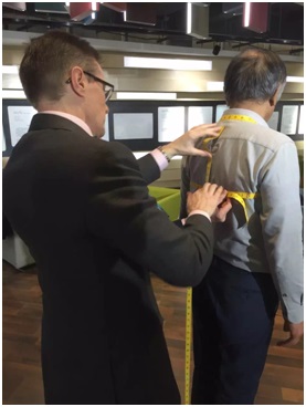 大师们根据中国客户的体型,带来了没有完工、里衬可见的套码样衣,一方面可以显示英式做工水准,另一方面可以让客户直接感受英式西服的款式和魅力。在测量完成后,大师会找出与客户身材相近的样衣让客户穿上,然后进行立体修正。如客户肩膀一高一低需要垫高,腰身的调整,袖笼大小是否合适等,用针一一固定,并记录在标有版式解构的图纸上。大师特别要求,一定要上下前后活动胳膊和肩部,以确保穿着后活动自如。